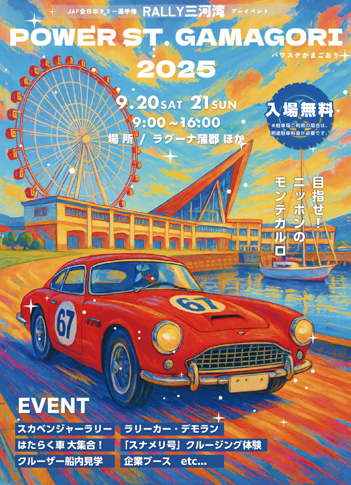 愛知県蒲郡市で開催される「POWER ST. GAMAGORI 2025(パワステがまごおり)」は、自動車ファンや家族連れに大人気のモータースポーツイベントです。今年は2025年9月20日(土)・21日(日)の2日間、ラグーナ蒲郡を中心に盛大に開催されます。入場は無料。子どもから大人までワクワクできる体験型プログラムが盛りだくさんです。